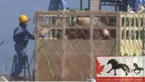 An animal transport truck arrives at an airport. It is one of five that evening, carrying horses that will be moved into crates and onto a plane destined for Japan, where they will be slaughtered to become sashimi. The plane was not scheduled to leave until hours later the following morning. Edmonton International Airport, Edmonton, Alberta, Canada, 2024. Jo-Anne McArthur / HSI Canada / We AnimalsDescription: Air shipments of live horses destined for slaughter in Japan occur regularly throughout the year from three Western Canadian airports, including this one in Edmonton, Alberta. According to Canadian Food Inspection Agency (CFIA) reports, more than 2,500 live horses, one to three years of age are exported to Japan annually, with each flight carrying approximately 100 animals. CFIA regulations allow a maximum journey of 28 hours without feed, water, or rest, from the time of loading at the farm or feedlot to offloading at the destination, yet some journeys have reportedly lasted over 32 hours. After leaving the feedlot, the horses spend several hours in transport trailers before being unloaded at the airport, inspected, and reloaded into shipping crates. Three or four horses are crowded into each crate, with no room to turn around or lie down. Then the crates are covered with netting that can restrict the horses’ heads or other body parts that may protrude from the small crates. The horses are loaded onto a cargo jet for departure several hours later. On this occasion, workers at Edmonton International Airport prepared empty crates in the late afternoon for the arrival of five semi-trucks filled with horses. The trucks began arriving around 8:30 PM to load the horses onto a flight departing for Japan at 6:00 am the following morning. The horses waited inside the trucks on the tarmac for several hours before being unloaded into an inspection building. Though obscured from view, their whinnies and stamping feet were audible from the public roadside over 200 meters away. Even before the trucks’ arrival, intense security was present, actively hindering attempts to document or observe the shipping process and blocking publicly accessible areas. Horses were still only at the beginning stage of unloading at 11:30 PM, hours before their impending 10 to 12-hour flight to Japan. These flights routinely stop to refuel in Anchorage, Alaska, subjecting the horses to further trauma and risk of injury during this extra takeoff and landing.